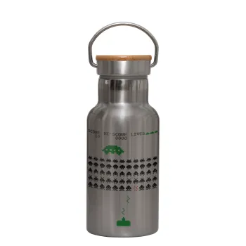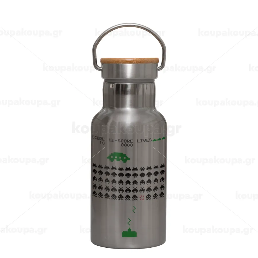 Space invaders, Μεταλλικό παγούρι θερμός (Stainless steel) Ασημένιο με ξύλινο καπακι (bamboo), διπλού τοιχώματος, 350ml