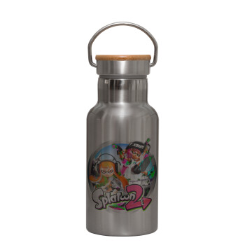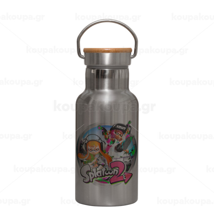 Splatoon 2, Μεταλλικό παγούρι θερμός (Stainless steel) Ασημένιο με ξύλινο καπακι (bamboo), διπλού τοιχώματος, 350ml