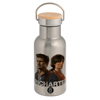 Uncharted, Μεταλλικό παγούρι θερμός (Stainless steel) Ασημένιο με ξύλινο καπακι (bamboo), διπλού τοιχώματος, 350ml