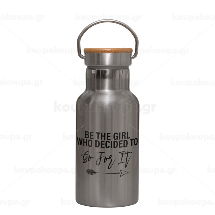 Be the girl who decided to, Μεταλλικό παγούρι θερμός (Stainless steel) Ασημένιο με ξύλινο καπακι (bamboo), διπλού τοιχώματος, 350ml