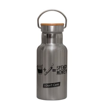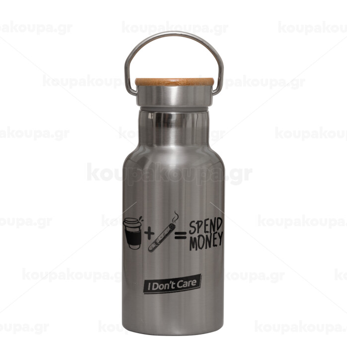 Spend Money, Μεταλλικό παγούρι θερμός (Stainless steel) Ασημένιο με ξύλινο καπακι (bamboo), διπλού τοιχώματος, 350ml