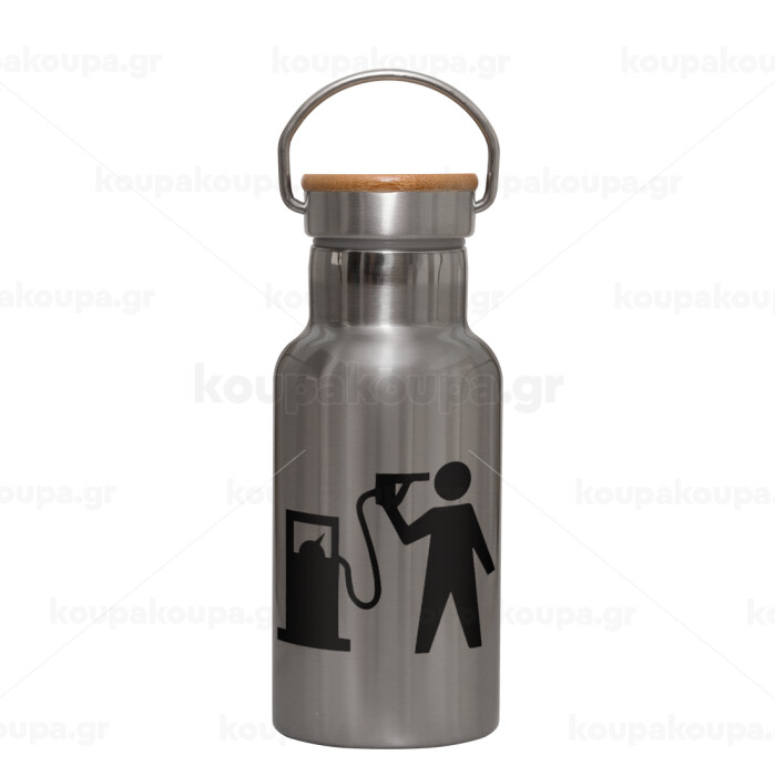 Fuel crisis, Μεταλλικό παγούρι θερμός (Stainless steel) Ασημένιο με ξύλινο καπακι (bamboo), διπλού τοιχώματος, 350ml