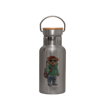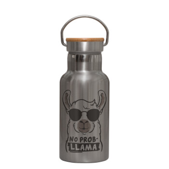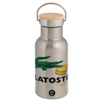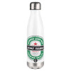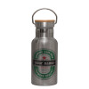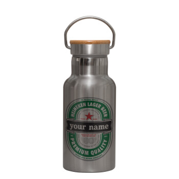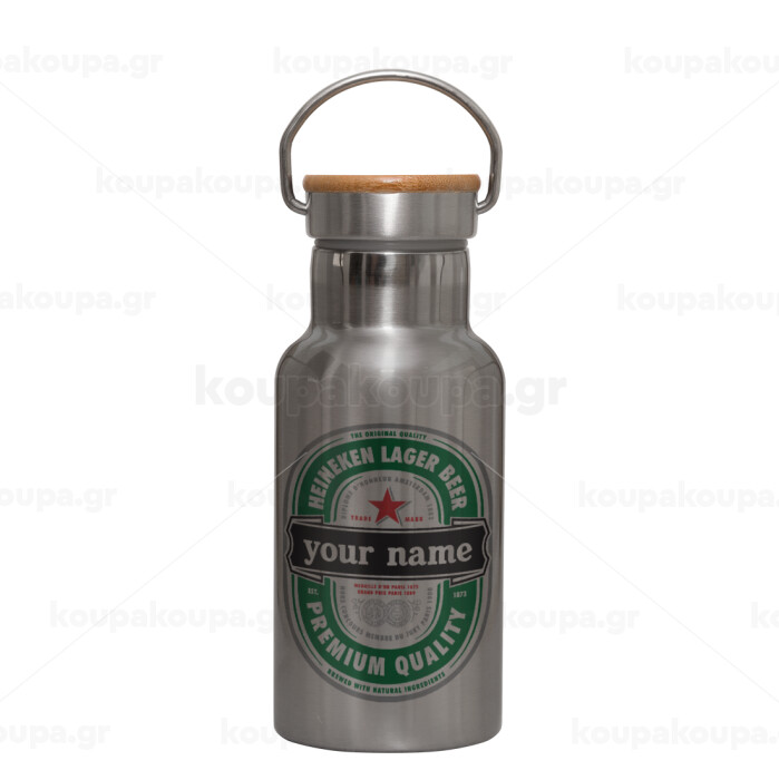 Heineken με όνομα, Μεταλλικό παγούρι θερμός (Stainless steel) Ασημένιο με ξύλινο καπακι (bamboo), διπλού τοιχώματος, 350ml