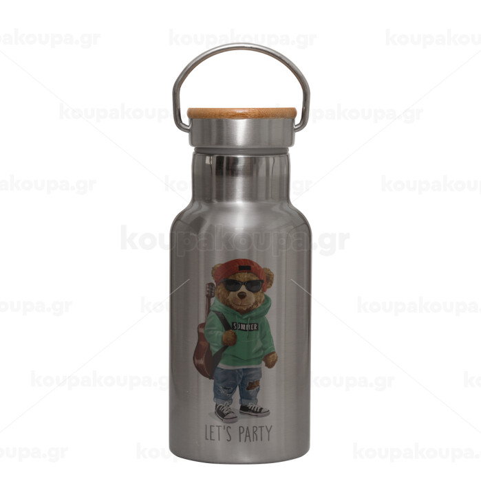 Let's Party Bear, Μεταλλικό παγούρι θερμός (Stainless steel) Ασημένιο με ξύλινο καπακι (bamboo), διπλού τοιχώματος, 350ml