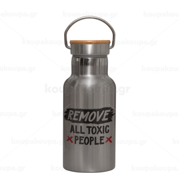 Remove all toxic people, Μεταλλικό παγούρι θερμός (Stainless steel) Ασημένιο με ξύλινο καπακι (bamboo), διπλού τοιχώματος, 350ml