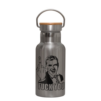 The finger, Μεταλλικό παγούρι θερμός (Stainless steel) Ασημένιο με ξύλινο καπακι (bamboo), διπλού τοιχώματος, 350ml