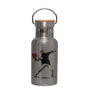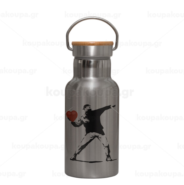 Banksy (The heart thrower), Μεταλλικό παγούρι θερμός (Stainless steel) Ασημένιο με ξύλινο καπακι (bamboo), διπλού τοιχώματος, 350ml