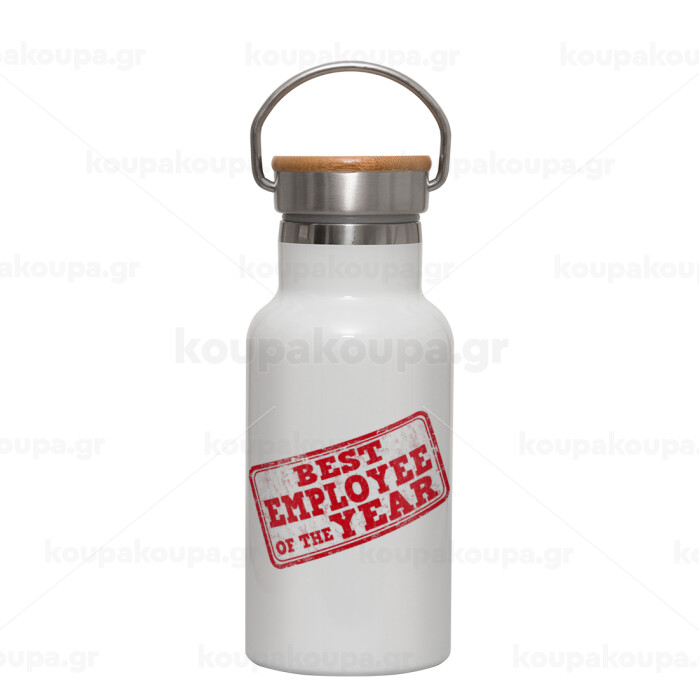 Best employee of the year, Μεταλλικό παγούρι θερμός (Stainless steel) Λευκό με ξύλινο καπακι (bamboo), διπλού τοιχώματος, 350ml