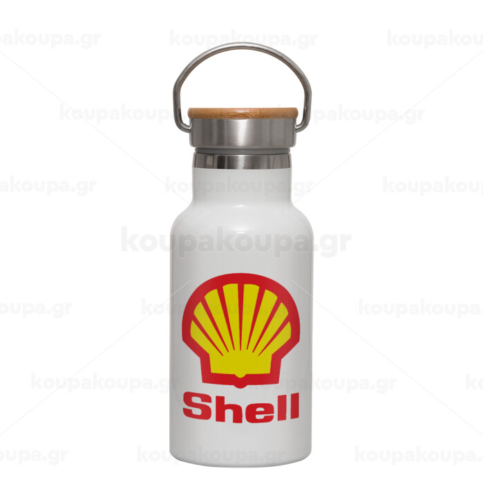 Πρατήριο καυσίμων SHELL, Μεταλλικό παγούρι θερμός (Stainless steel) Λευκό με ξύλινο καπακι (bamboo), διπλού τοιχώματος, 350ml