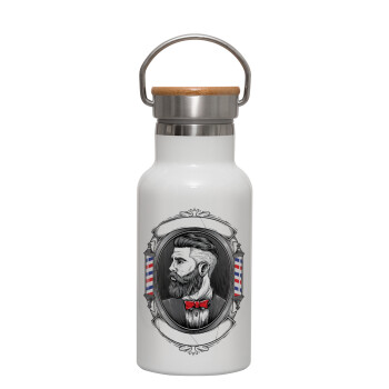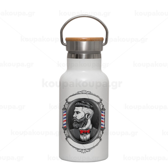 Barber shop, Μεταλλικό παγούρι θερμός (Stainless steel) Λευκό με ξύλινο καπακι (bamboo), διπλού τοιχώματος, 350ml