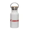Canon, Μεταλλικό παγούρι θερμός (Stainless steel) Λευκό με ξύλινο καπακι (bamboo), διπλού τοιχώματος, 350ml
