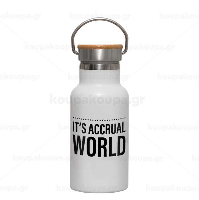 It's an accrual world, Μεταλλικό παγούρι θερμός (Stainless steel) Λευκό με ξύλινο καπακι (bamboo), διπλού τοιχώματος, 350ml