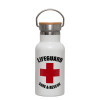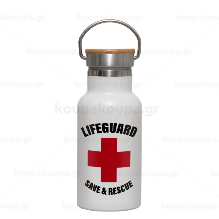 Lifeguard Save & Rescue, Μεταλλικό παγούρι θερμός (Stainless steel) Λευκό με ξύλινο καπακι (bamboo), διπλού τοιχώματος, 350ml