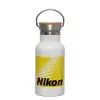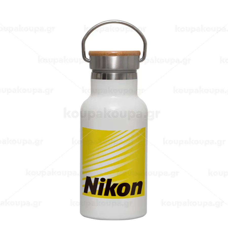 Nikon, Μεταλλικό παγούρι θερμός (Stainless steel) Λευκό με ξύλινο καπακι (bamboo), διπλού τοιχώματος, 350ml