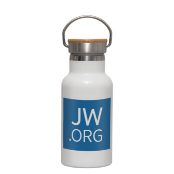 JW.ORG, Μεταλλικό παγούρι θερμός (Stainless steel) Λευκό με ξύλινο καπακι (bamboo), διπλού τοιχώματος, 350ml