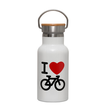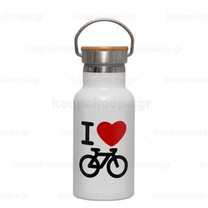 I love Bike, Μεταλλικό παγούρι θερμός (Stainless steel) Λευκό με ξύλινο καπακι (bamboo), διπλού τοιχώματος, 350ml