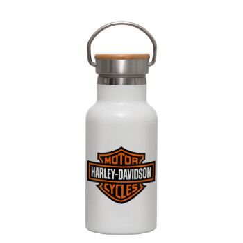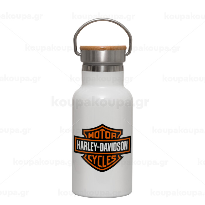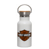 Motor Harley Davidson, Μεταλλικό παγούρι θερμός (Stainless steel) Λευκό με ξύλινο καπακι (bamboo), διπλού τοιχώματος, 350ml