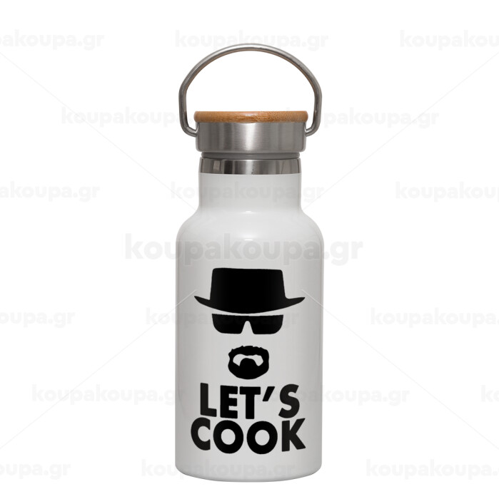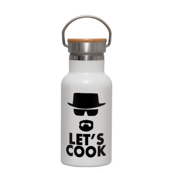 Let's cook, Μεταλλικό παγούρι θερμός (Stainless steel) Λευκό με ξύλινο καπακι (bamboo), διπλού τοιχώματος, 350ml