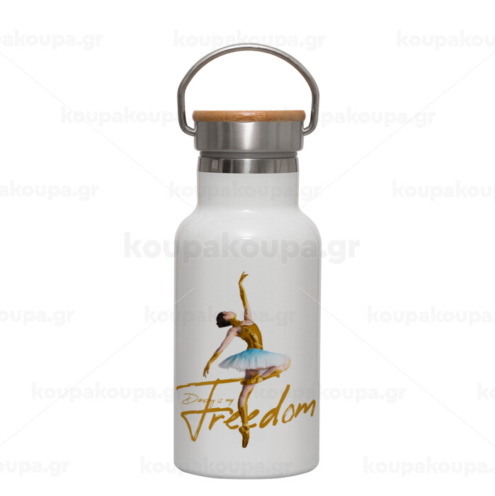 Gold Dancer, Μεταλλικό παγούρι θερμός (Stainless steel) Λευκό με ξύλινο καπακι (bamboo), διπλού τοιχώματος, 350ml