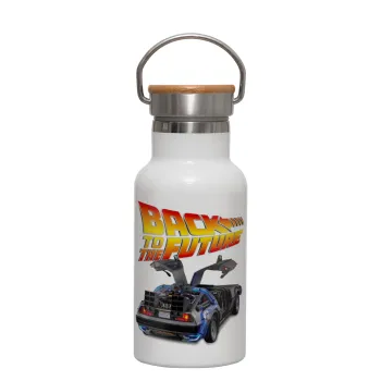 Back to the future, Μεταλλικό παγούρι θερμός (Stainless steel) Λευκό με ξύλινο καπακι (bamboo), διπλού τοιχώματος, 350ml