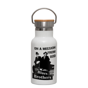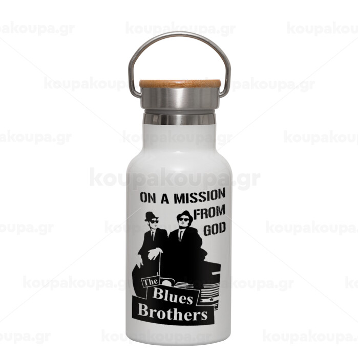 Blues brothers on a mission from God, Μεταλλικό παγούρι θερμός (Stainless steel) Λευκό με ξύλινο καπακι (bamboo), διπλού τοιχώματος, 350ml