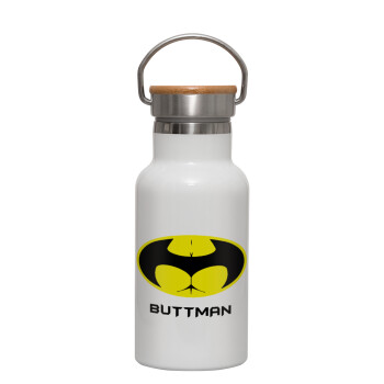 Buttman, Μεταλλικό παγούρι θερμός (Stainless steel) Λευκό με ξύλινο καπακι (bamboo), διπλού τοιχώματος, 350ml