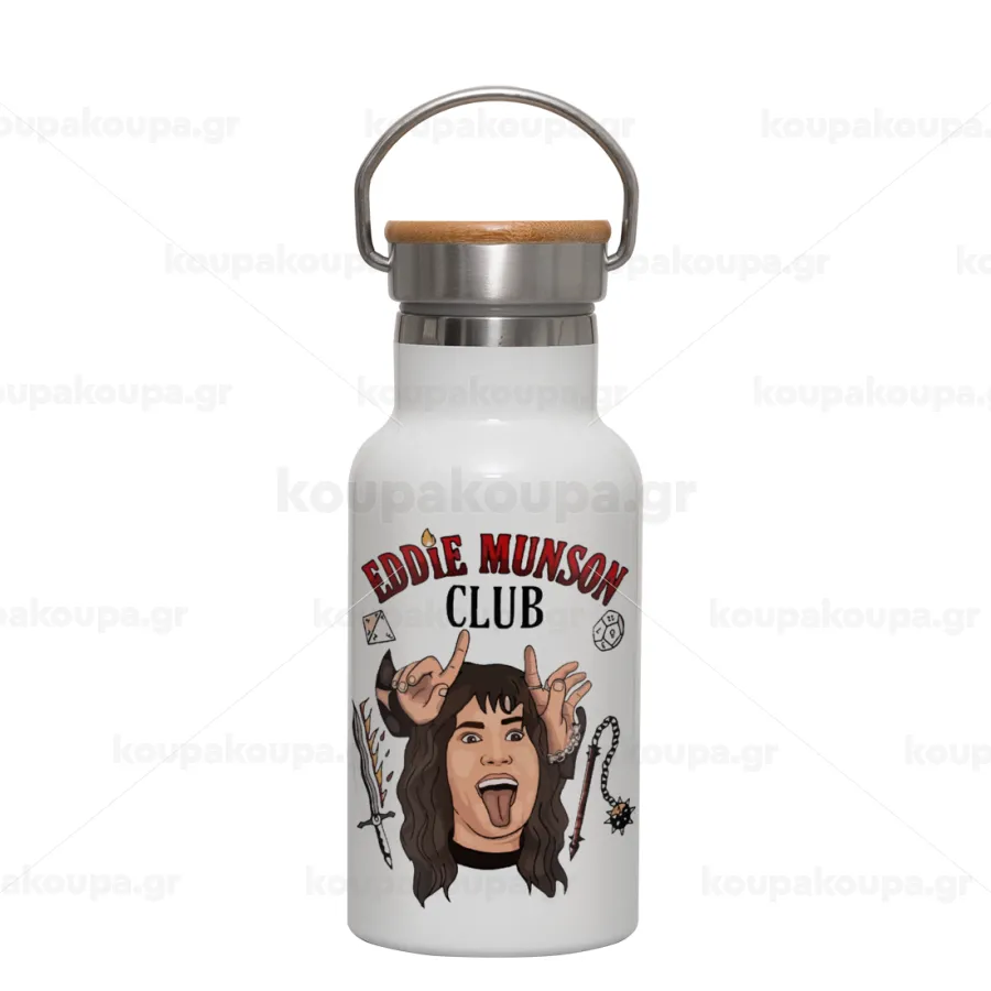 Eddie Munson, Hellfire CLub, Stranger Things, Μεταλλικό παγούρι θερμός (Stainless steel) Λευκό με ξύλινο καπακι (bamboo), διπλού τοιχώματος, 350ml