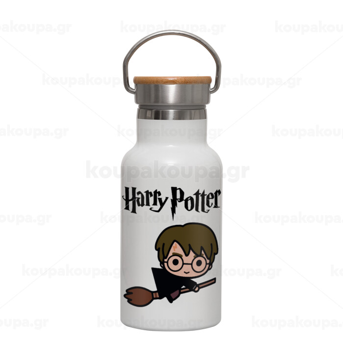 Harry potter kid, Μεταλλικό παγούρι θερμός (Stainless steel) Λευκό με ξύλινο καπακι (bamboo), διπλού τοιχώματος, 350ml