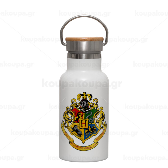Hogwart's, Μεταλλικό παγούρι θερμός (Stainless steel) Λευκό με ξύλινο καπακι (bamboo), διπλού τοιχώματος, 350ml