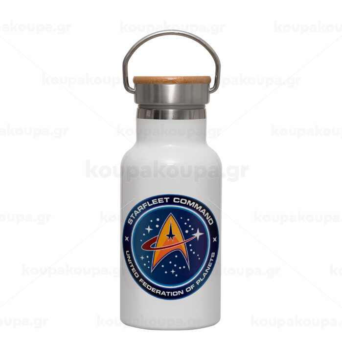 Starfleet command, Μεταλλικό παγούρι θερμός (Stainless steel) Λευκό με ξύλινο καπακι (bamboo), διπλού τοιχώματος, 350ml