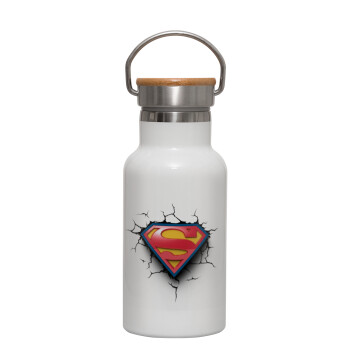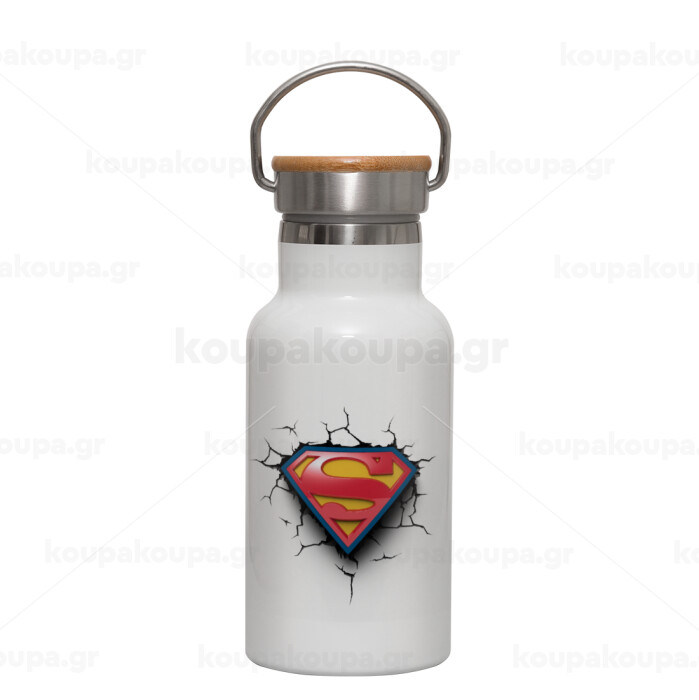 Superman cracked, Μεταλλικό παγούρι θερμός (Stainless steel) Λευκό με ξύλινο καπακι (bamboo), διπλού τοιχώματος, 350ml