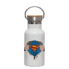 Superman hands, Μεταλλικό παγούρι θερμός (Stainless steel) Λευκό με ξύλινο καπακι (bamboo), διπλού τοιχώματος, 350ml