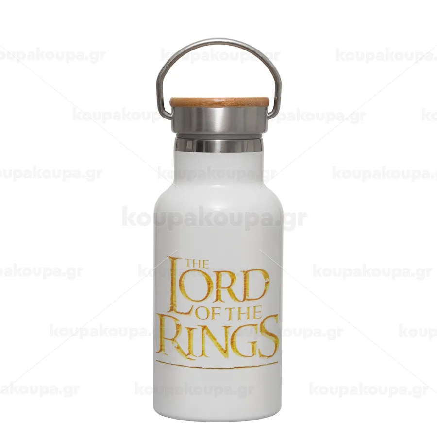 The Lord of the Rings, Μεταλλικό παγούρι θερμός (Stainless steel) Λευκό με ξύλινο καπακι (bamboo), διπλού τοιχώματος, 350ml