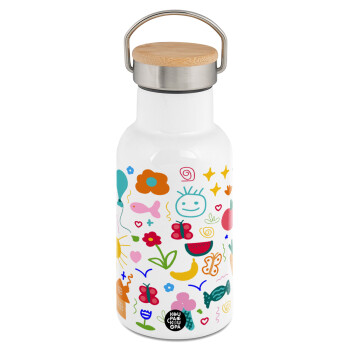 Παιδική φαντασία, Μεταλλικό παγούρι θερμός (Stainless steel) Λευκό με ξύλινο καπακι (bamboo), διπλού τοιχώματος, 350ml