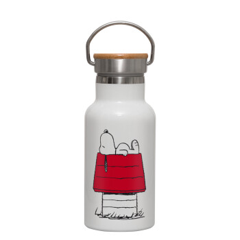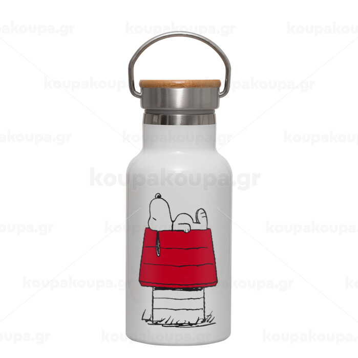Το σπίτι του snoopy, Μεταλλικό παγούρι θερμός (Stainless steel) Λευκό με ξύλινο καπακι (bamboo), διπλού τοιχώματος, 350ml