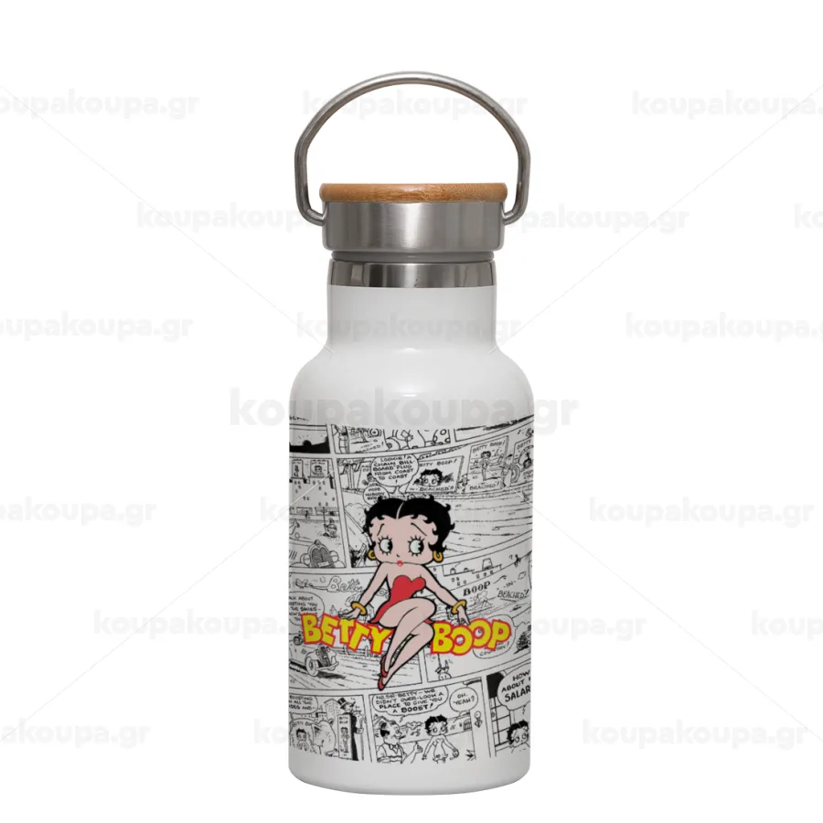 Betty Boop, Μεταλλικό παγούρι θερμός (Stainless steel) Λευκό με ξύλινο καπακι (bamboo), διπλού τοιχώματος, 350ml