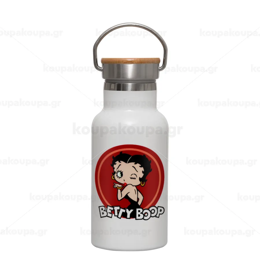 Betty Boop kiss, Μεταλλικό παγούρι θερμός (Stainless steel) Λευκό με ξύλινο καπακι (bamboo), διπλού τοιχώματος, 350ml