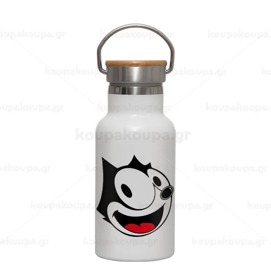 Felix the cat, Μεταλλικό παγούρι θερμός (Stainless steel) Λευκό με ξύλινο καπακι (bamboo), διπλού τοιχώματος, 350ml
