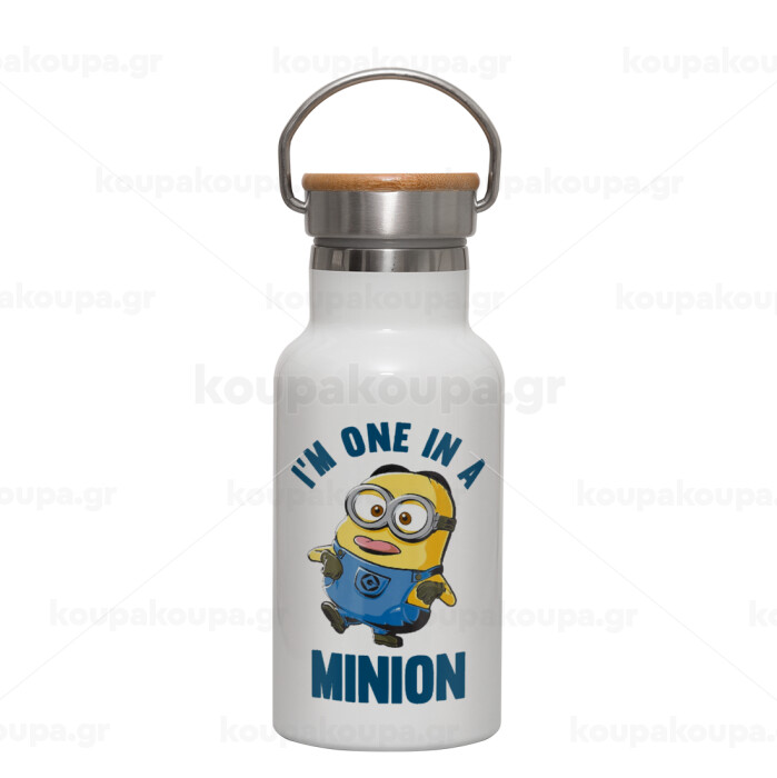 I'm one in a minion, Μεταλλικό παγούρι θερμός (Stainless steel) Λευκό με ξύλινο καπακι (bamboo), διπλού τοιχώματος, 350ml