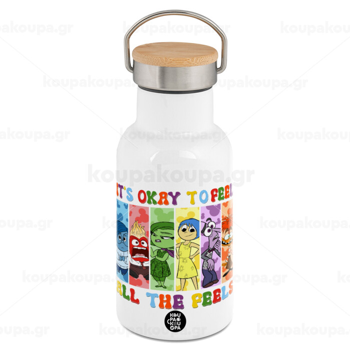 Inside Out It's Okay To Feel All The Feels , Μεταλλικό παγούρι θερμός (Stainless steel) Λευκό με ξύλινο καπακι (bamboo), διπλού τοιχώματος, 350ml