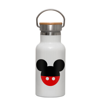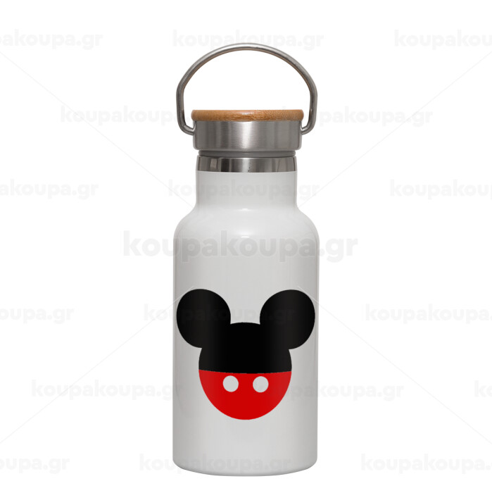 Mickey head, Μεταλλικό παγούρι θερμός (Stainless steel) Λευκό με ξύλινο καπακι (bamboo), διπλού τοιχώματος, 350ml