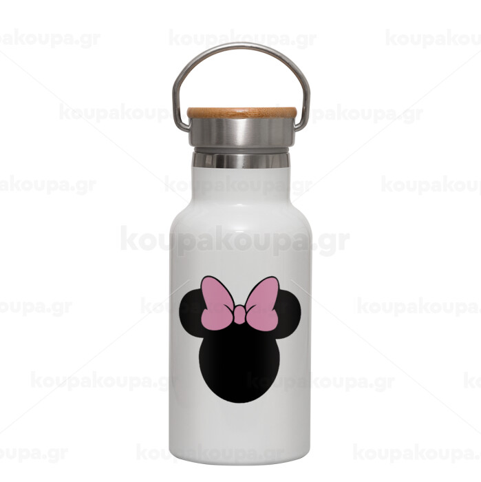 mouse girl, Μεταλλικό παγούρι θερμός (Stainless steel) Λευκό με ξύλινο καπακι (bamboo), διπλού τοιχώματος, 350ml
