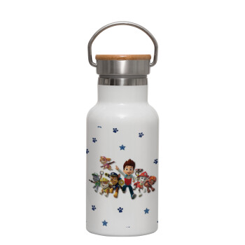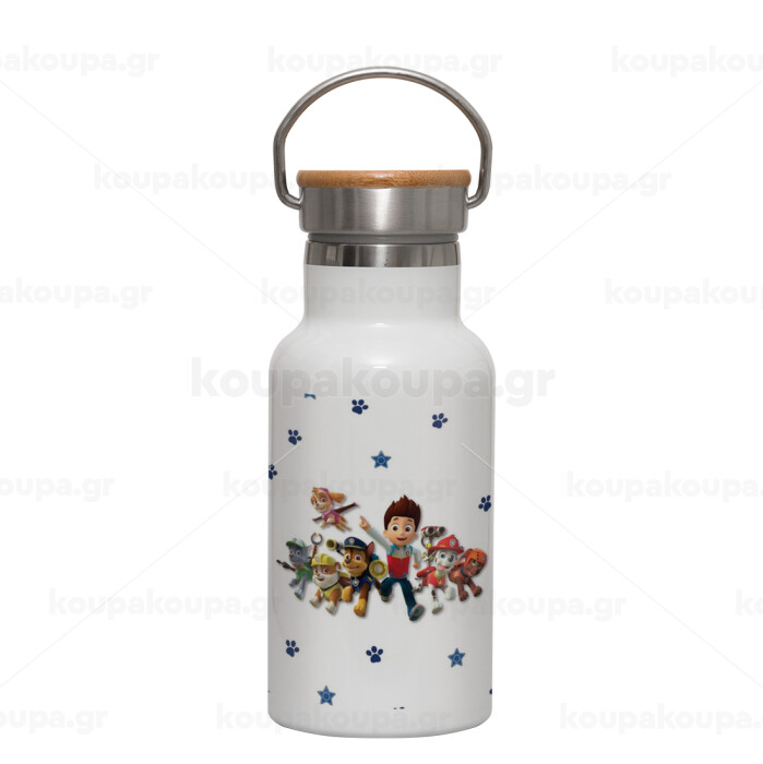 paw patrol, Μεταλλικό παγούρι θερμός (Stainless steel) Λευκό με ξύλινο καπακι (bamboo), διπλού τοιχώματος, 350ml