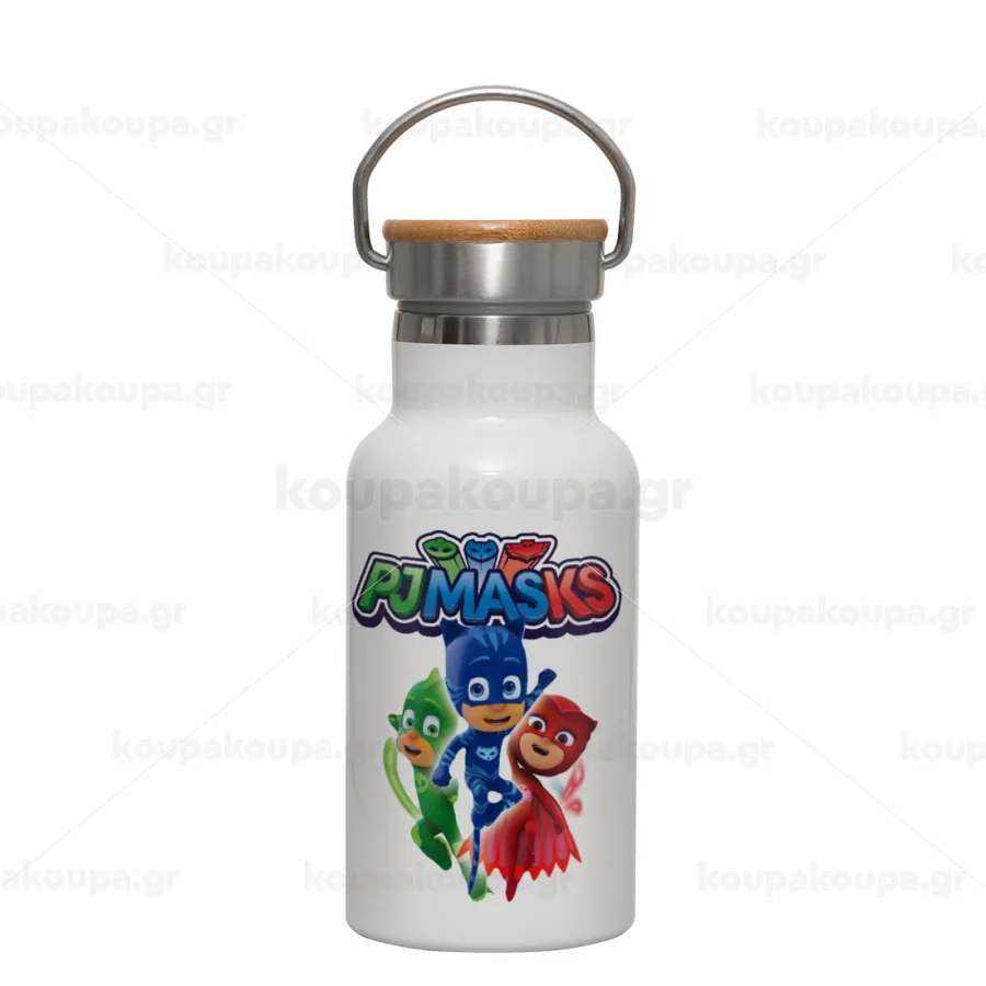 PJ masks, Μεταλλικό παγούρι θερμός (Stainless steel) Λευκό με ξύλινο καπακι (bamboo), διπλού τοιχώματος, 350ml