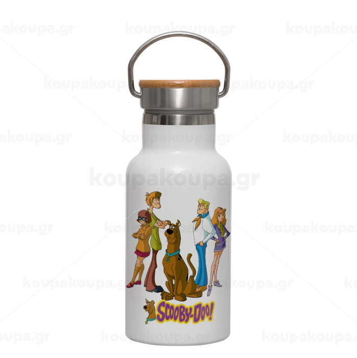 Scooby Doo Characters, Μεταλλικό παγούρι θερμός (Stainless steel) Λευκό με ξύλινο καπακι (bamboo), διπλού τοιχώματος, 350ml