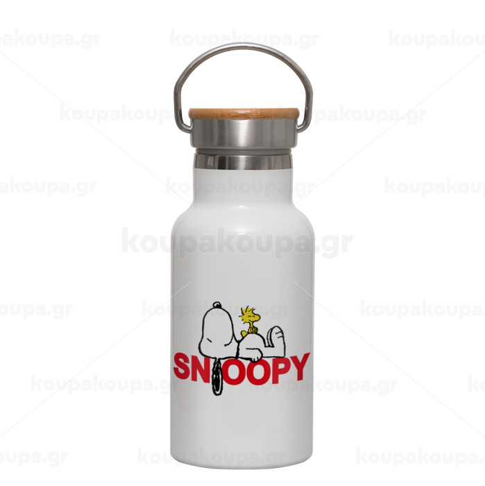 Snoopy sleep, Μεταλλικό παγούρι θερμός (Stainless steel) Λευκό με ξύλινο καπακι (bamboo), διπλού τοιχώματος, 350ml