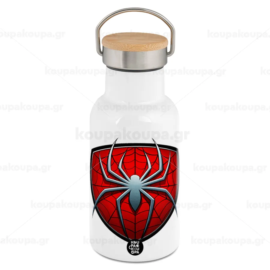 Spider-man, Μεταλλικό παγούρι θερμός (Stainless steel) Λευκό με ξύλινο καπακι (bamboo), διπλού τοιχώματος, 350ml