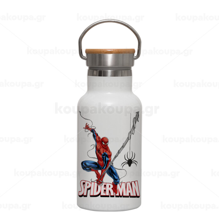 Spiderman fly, Μεταλλικό παγούρι θερμός (Stainless steel) Λευκό με ξύλινο καπακι (bamboo), διπλού τοιχώματος, 350ml
