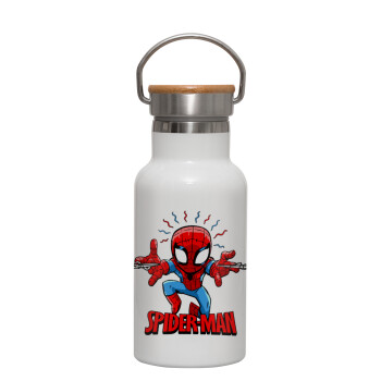 Spiderman flying, Μεταλλικό παγούρι θερμός (Stainless steel) Λευκό με ξύλινο καπακι (bamboo), διπλού τοιχώματος, 350ml