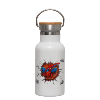 Spiderman wall, Μεταλλικό παγούρι θερμός (Stainless steel) Λευκό με ξύλινο καπακι (bamboo), διπλού τοιχώματος, 350ml